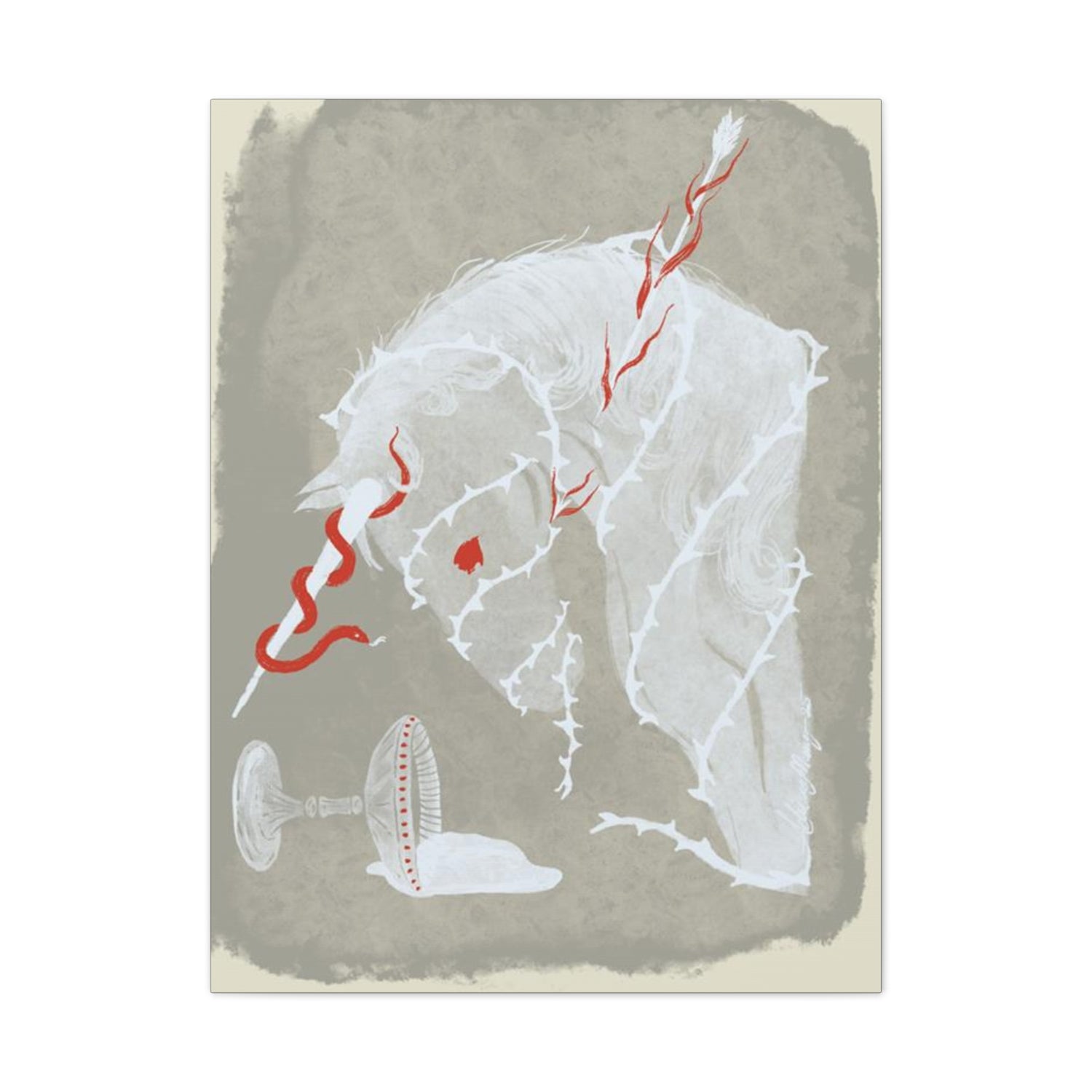 A unique canvas featuring a unicorn wrapped in thorns, pierced by an arrow and with a snake, spilled chalice, occult, feminist art, and medieval vibes. Perfect for those who appreciate dark and mystical artwork, this canvas would make a great addition to any eclectic home decor. Ideal for fans of medieval art and feminist symbolism. Relevant for Halloween, International Women's Day, or as a statement piece year-round.